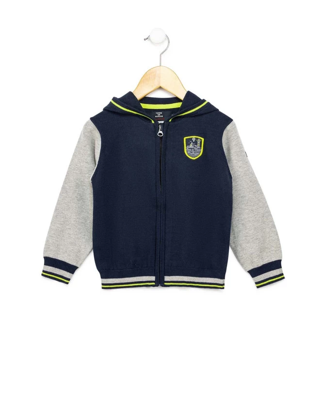 Coloris bleu marine et gris chiné sur les manches avec ecusson original sur la poitrine.