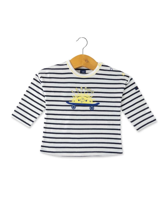 Son design rayé classique est modernisé par des détails comme les surpiqûres contrastées au col et les pressions pratiques à l’épaule. Le visuel sur la poitrine ajoute une touche ludique et enfantine.