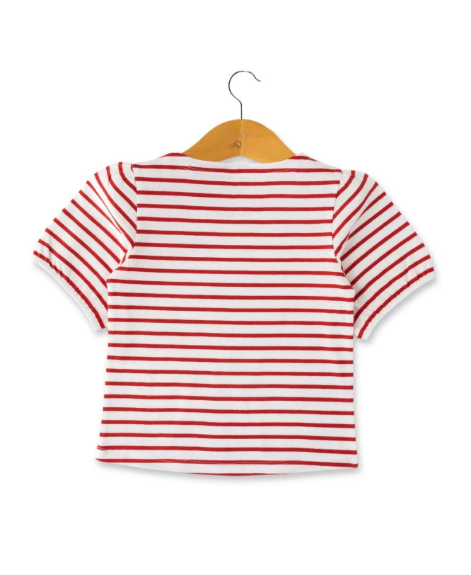 • Léger, respirant et agréable au toucher, un véritable essentiel. Marinière manches courtes Col rond Rayé bicolore Manches bouffantes Bas de manches élastiqués Logo imprimé poitrine Existe en plusieurs coloris