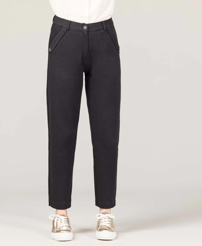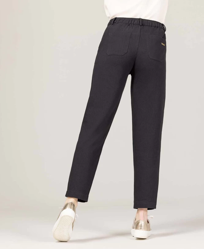 Sa taille élastiquée au dos assure un ajustement parfait et un confort optimal. L’ouverture à braguette et bouton apporte une touche classique, tandis que les poches avant à rabats avec boutons fantaisie ajoutent du caractère. Son format 7/8ème allonge la silhouette et permet de le porter aussi bien avec des baskets que des chaussures habillées.