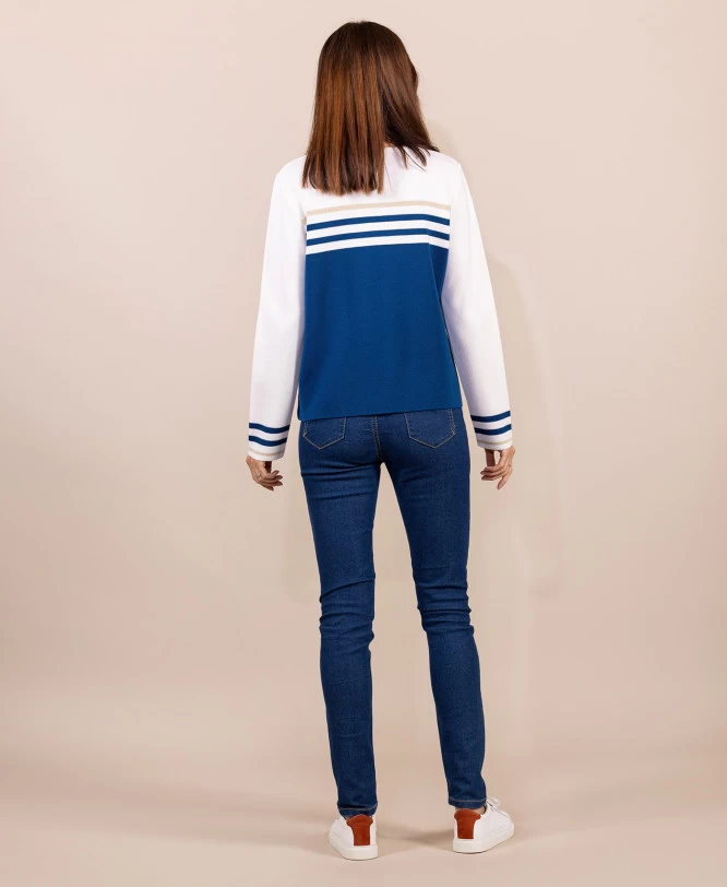 - Jeu de rayures au niveau du haut devant et dos ainsi qu’en bas de manches