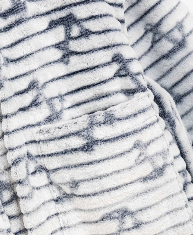 Effet fausse fourrure, ceinture à la taille, deux poches plaquées sur le devant et capuche. Robe de chambre recouverte d’un imprimé exclusif sur une matière en maille confortable et chaude.