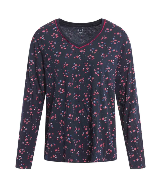 Tee shirt manches longues femme-imprimé floral sur fond bleu nuit