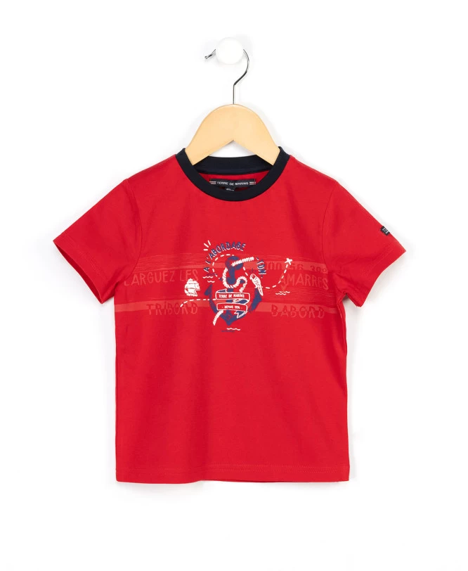 Tee-shirt manches courtes garçon marine- 100 % COTON – Col rond Ă bordure rouge – Motif original sur la poitrine- Dos et manches marine -Une invitation Ă larguer les amarres avec ce T-shirt essentiel dans la garde robe de votre garçon ! Existe en rouge.