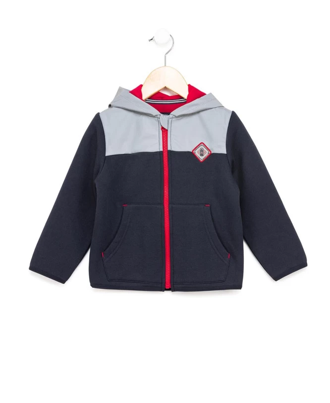 Coloris bleu marine et matière réfléchissante au niveau de la capuche, écusson identitaire sur la poitrine, ouverture zippée avec protection à l’encolure, 2 poches avant.